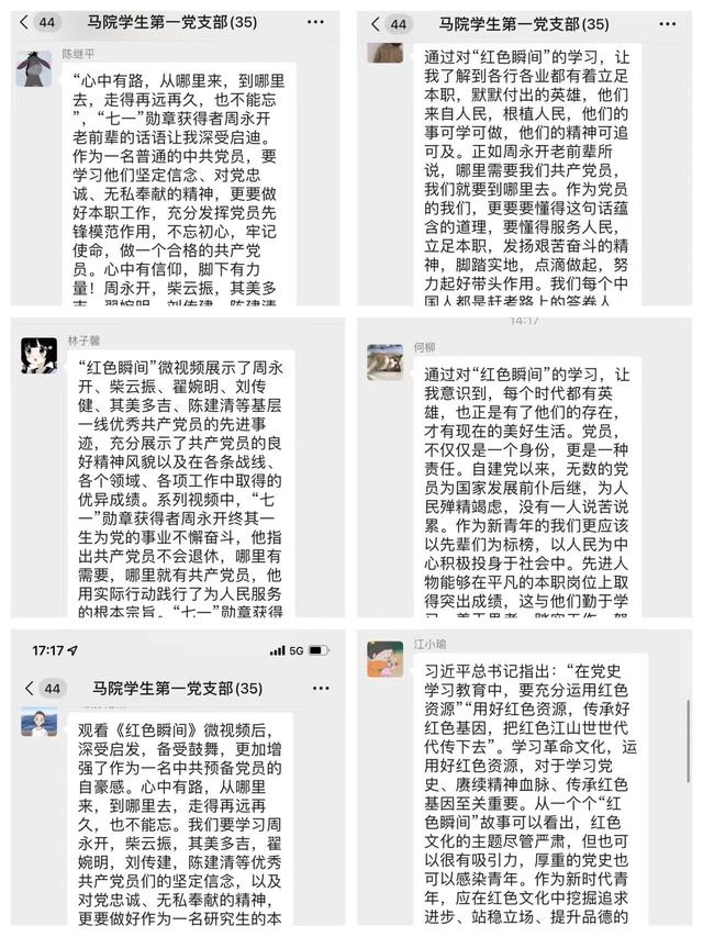 红色瞬间”微视频中,周永开、柴云振、其美多吉、翟婉明、刘传健、陈建清等6名典型人物事迹鼓舞着我们要有甘于平凡默默奉献的坚韧精神,要进一步学习好、继承好、发扬好长征精神,以先辈为榜样,传承红色基因、牢记初心使命。微视频参观结束后,支部党员纷纷情不自禁的在微信群中畅谈自己的理解与感悟:“作为一名马克思主义理论专业的研究生党员,应在学习红色文化中充分运用红色资源、传承红色基因”、“不断提升个人的政治素养和家国情怀,积极引导身边青年认识红色文化资源的价值,树立正确的理想信念”、“努力学好马克思主义理论专业相关知识和其他知识,不断提高为人民服务的本领,保持见贤思齐、崇尚先进、争做先锋的良好态势,为社会主义现代化建设和中华民族伟大复兴奉献自己的青春力量。”