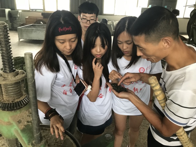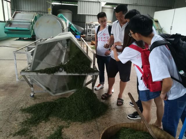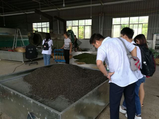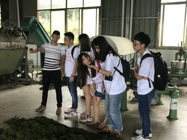 当天下午,志愿者们跟随邱乡长及相关人员来到田坝村茶叶生产基地,实地了解彝族乡当地茶叶种植、采摘、加工等生产流程。据车间杨师傅介绍,新鲜茶叶的加工程序主要包括杀青、一次脱水、揉捻、烘干、做型、提香、包装等环节。目前,该生产基地新茶叶加工产量为1.2万斤/天,成品茶叶产量为2000斤/天,年成品茶叶产量达70余万斤。
