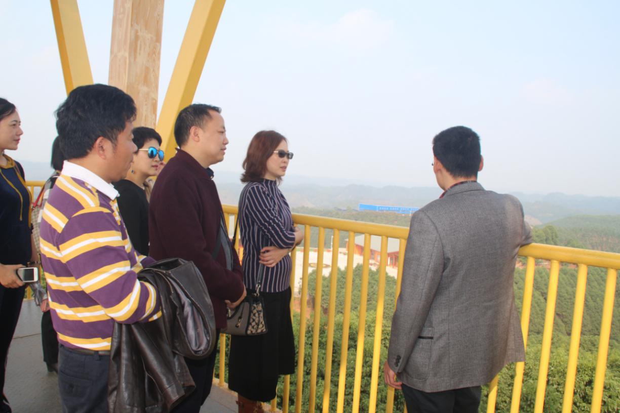 △油樟林观景台上宜宾市叙州区当地工作人员向伟德bv国际体育实践考察队介绍油樟种植情况