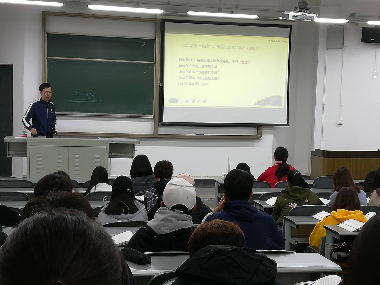 本堂公开课主讲老师为刘伟明博士,刘老师从回顾维新变法失败的原因教训入手导入第三章辛亥革命与君主专制制度的终结,分别从帝国主义列强加紧侵略与民族危机的加深、清末新政及其破产、资产阶级的成长与资产阶级革命思想的传播等方面详细为大家讲述了辛亥革命爆发的历史条件。刘博士具有广博的历史知识,讲解问题思路清晰,也极有深度,尤其是将历史问题与现实问题相联系,对于扩大学生的视野,培养学生的思维能力具有积极意义。